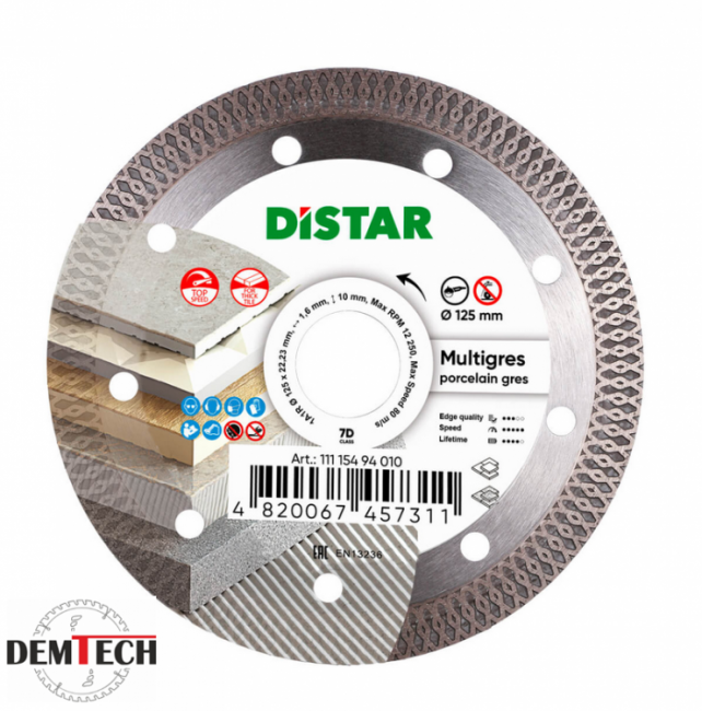 Tarcza diamentowa Distar Multigres zaprojektowana do cięcia płytek porcelanowych oraz twardego gresu o grubości do 20 mm. Tarcza wyróżnia się wysokim na 10 mm i wyjątkowo cienkim segmentem diamentowym o grubości 1,4 mm, co przekłada się na wysoką prędkość cięcia oraz ponadprzeciętną żywotność.